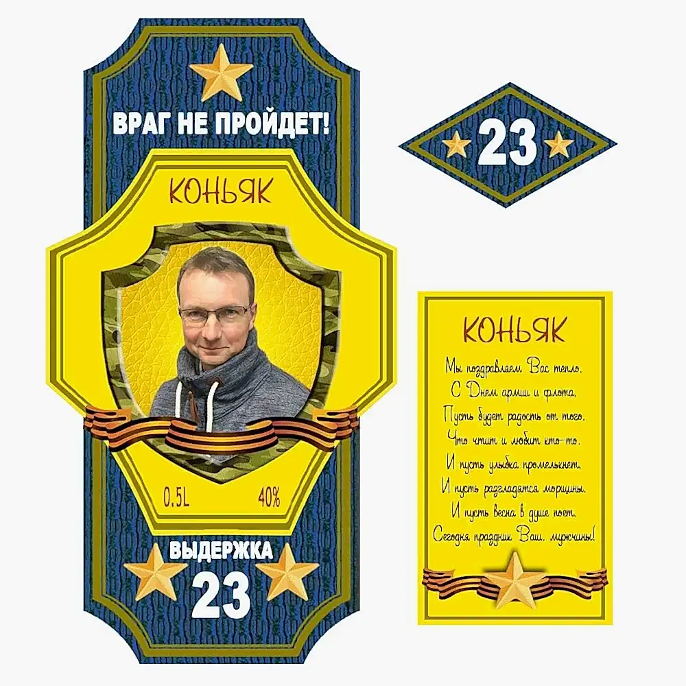 Этикетка на коньяк на 23 февраля. Можно поздравить своего Защитника или PinUp часть Вашего коллектива.