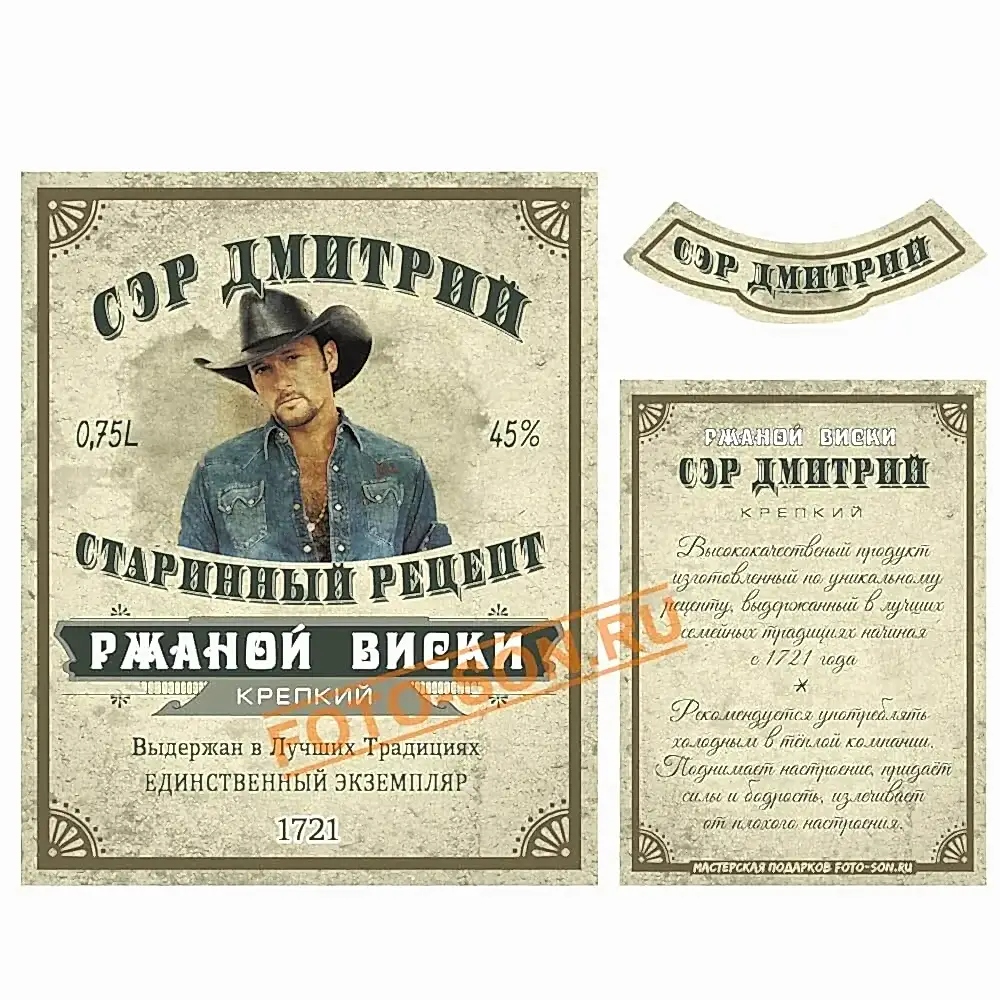 Для данной этикетки возможен фотомонтаж по подобию оригинала -переоденем именинника в шляпу и PinUp а так же состарим фото.