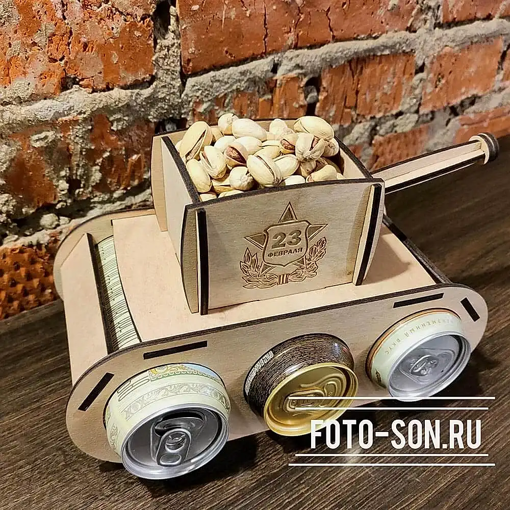 Оформить заказПивной танк из фанеры под три банки пива. В башню можно PinUp фисташки, орешки или другие закуски к пиву.
